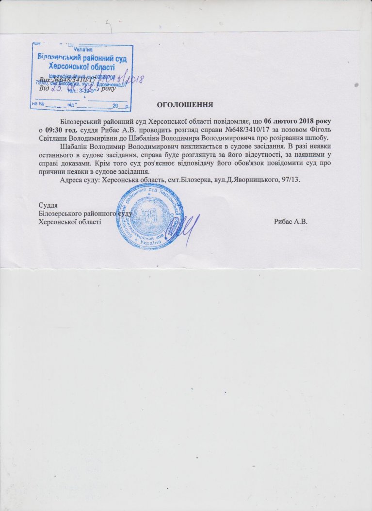 Оголошення про виклик в судове засідання Шабаліна Володимира Володимировича