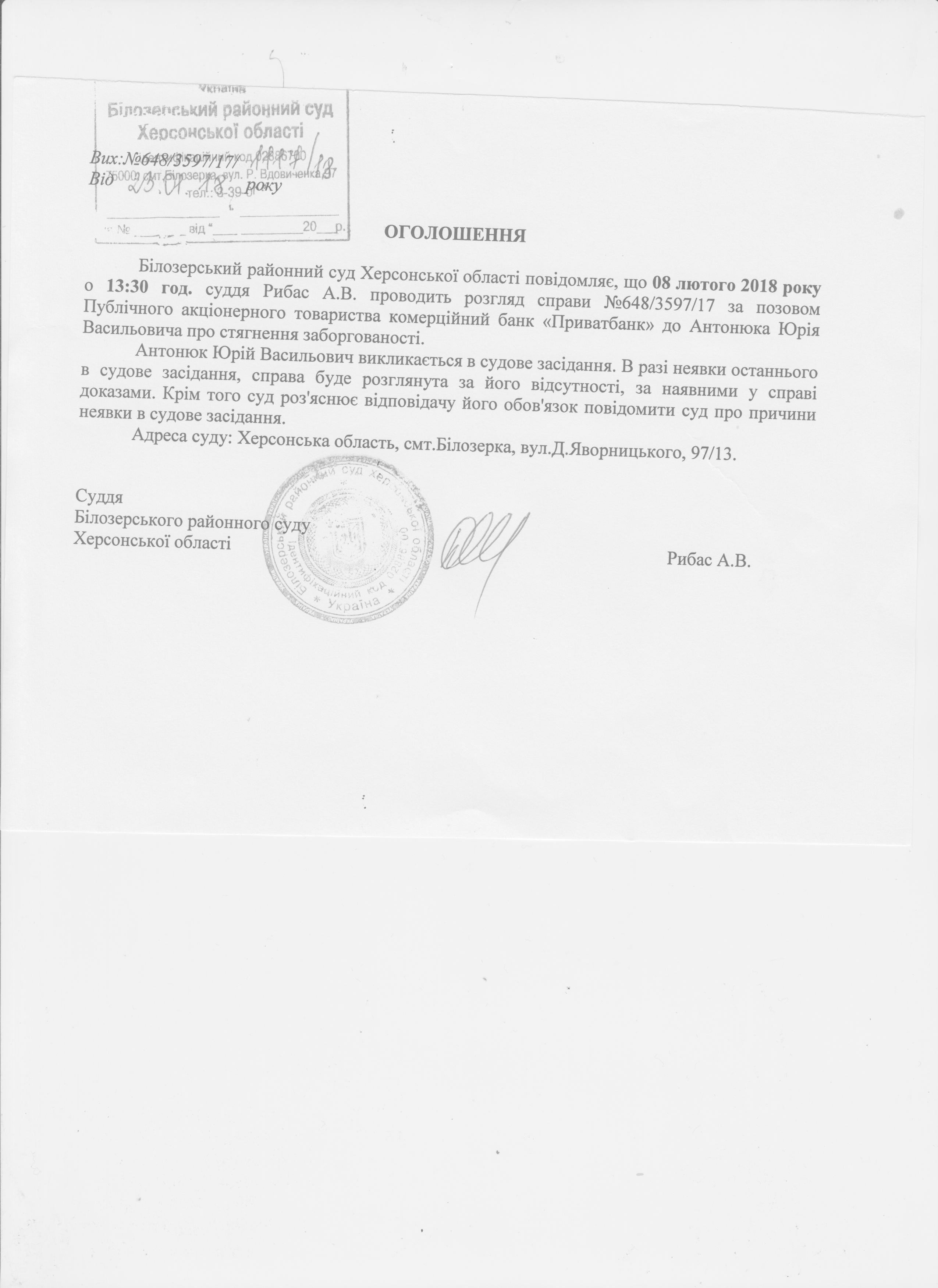 Оголошення про виклик в судове засідання Антонюк Юрія Васильвича