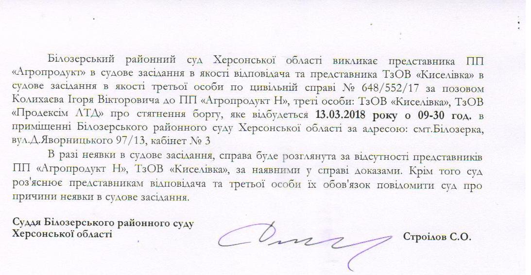 Оголошення про виклик в судове засідання представника ПП "Агропродукт" в якості відповідача та представкика ТзОВ "Киселівка" в якості 3-ї особи